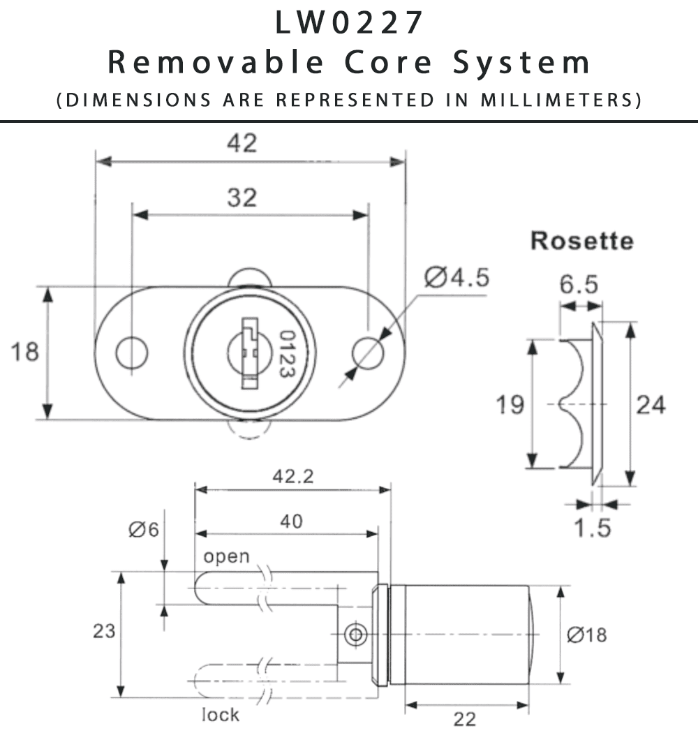 This A-ZUM LW0227 Front Gang Drawer and Cabinet Door Lock Housing with a Removable Lock Core System. Includes one LW0227 lock housing, two matching flip keys, and one rosette.