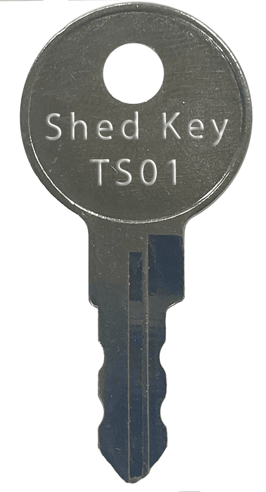 Replacement key for TS Shed lock numbers in the TS01-TS40 range. Keys are designed to work on various TS Shed locks that match the same number (ie: a TS01 key will only work on a TS01 lock). Found on various garage shed, cabin shells and outdoor sheds made by TS Shed.